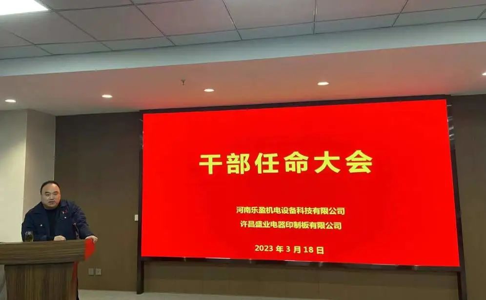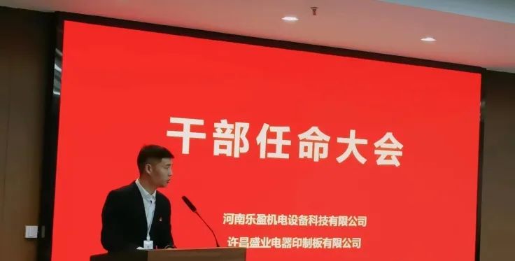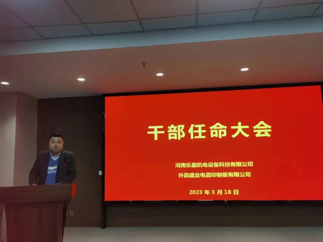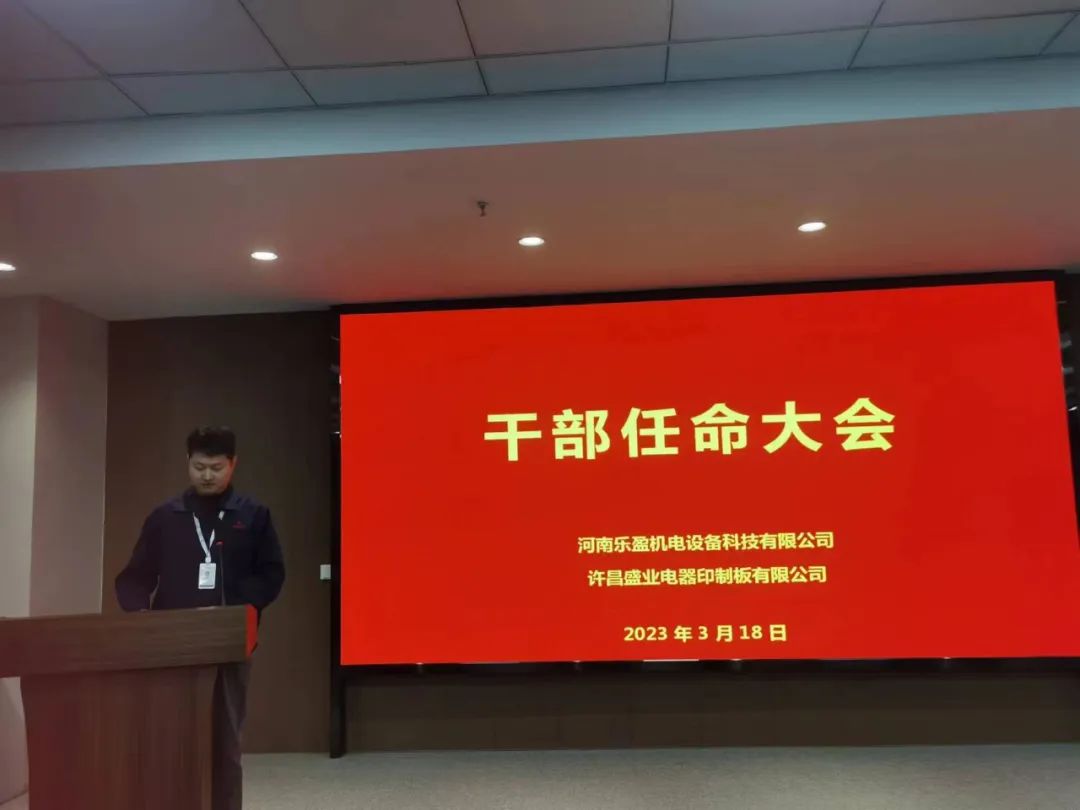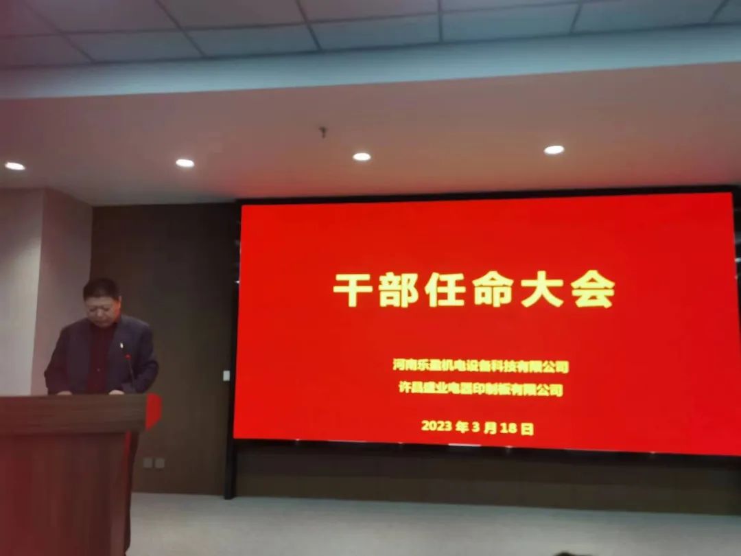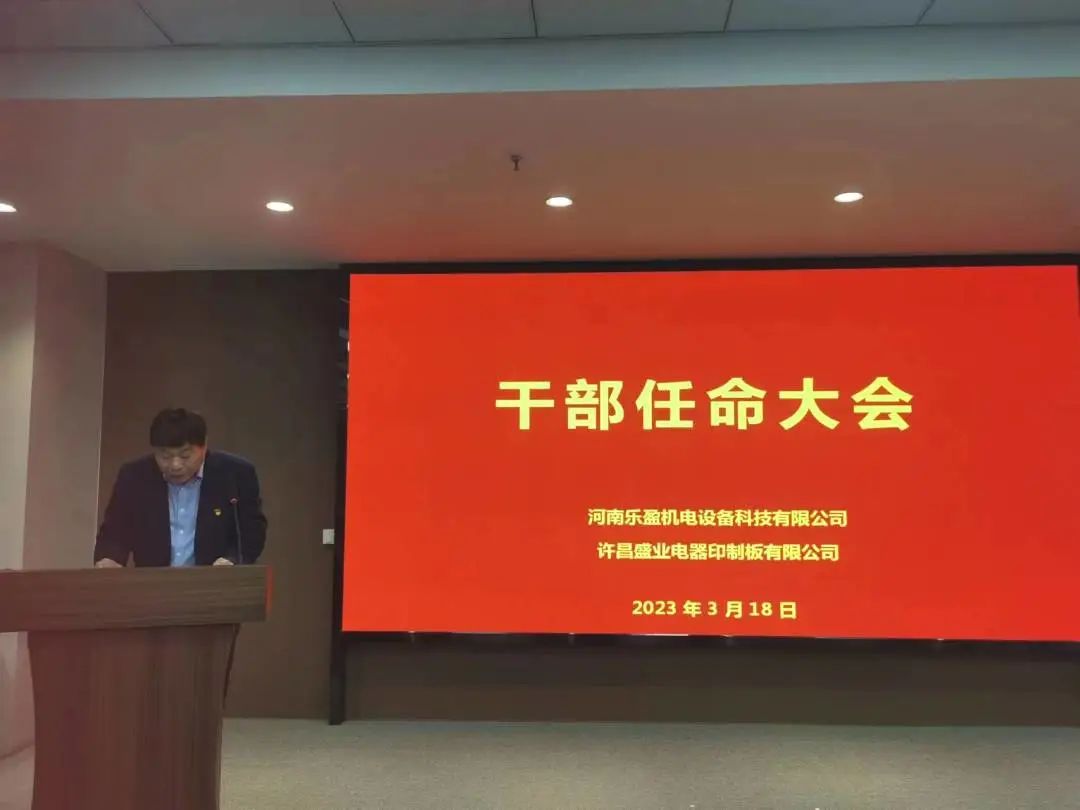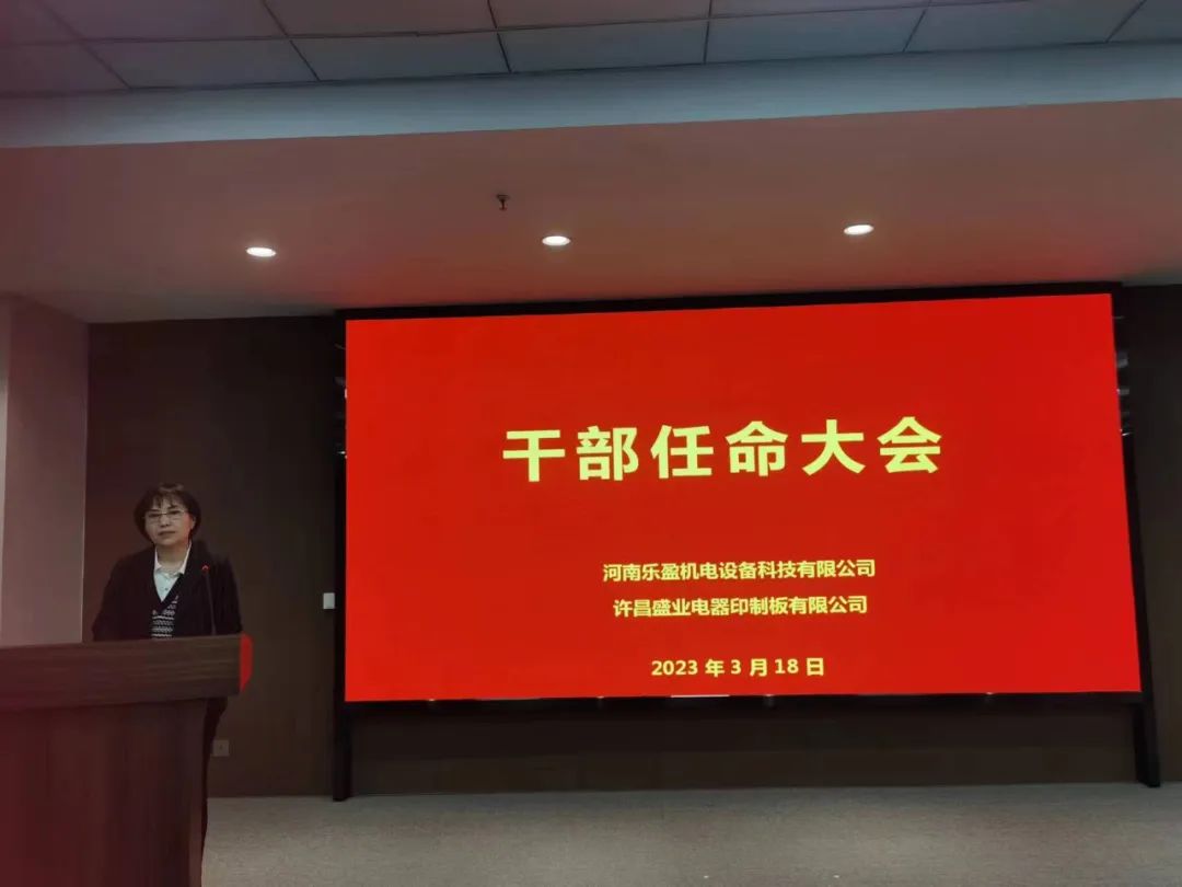 會(huì)上主持人宣讀了任職文件,宣布李方同志擔(dān)任河南樂盈機(jī)電設(shè)備科技有限公司總經(jīng)理、朱春曉同志擔(dān)任許昌盛業(yè)電器印制板有限公司總經(jīng)理,以及公司各部門負(fù)責(zé)人任命書。